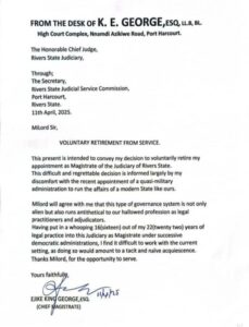 A Chief Magistrate in the Rivers State Judiciary, Ejike King George has announced his voluntary retirement.